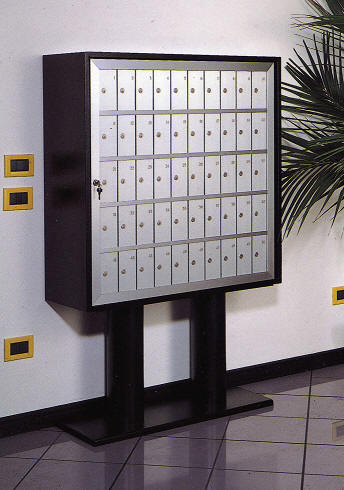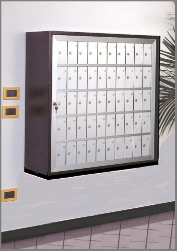Casellari disponibili da 50 e 100 vani, con zoccolo, gamboni su piastra a terra, oppure pensili predisposti per ancoraggio a parete.