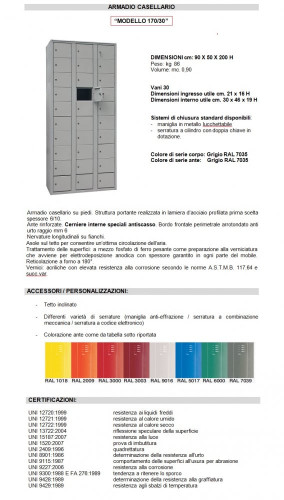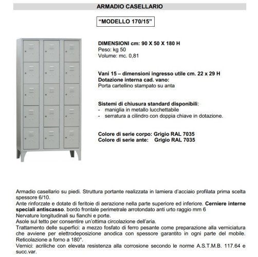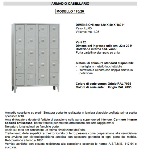 Armadi Porta Oggetti in metallo, a 10, 15, 20, 24, 30 vani, realizzati in lamiera di acciaio spessore 6/10, verniciati in colore Grigio Chiaro RAL 7035, oppure verniciati in vari colori extra.