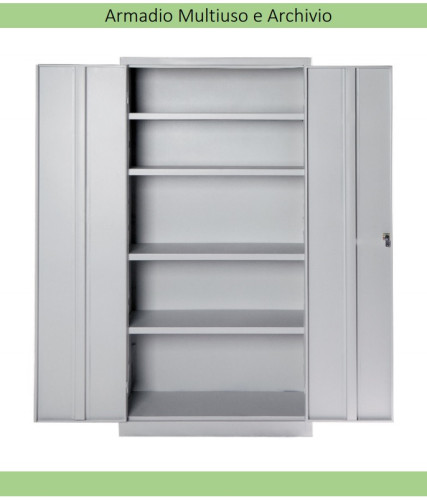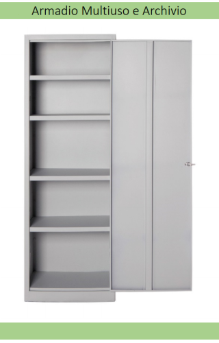 Armadio vers. TUTTO PIANI con un'anta a battente, oppure doppia anta a battente, completa di serratura a cilindro con chiave fornita in duplice copia.