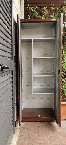 Gli armadi da esterni zincoplasticati, tipo Porta Scope, sono dotati internamente di un vano verticale Porta Scope e di pianetti metallici spostabili.