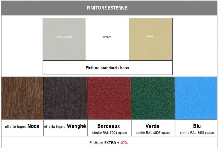 Le lamiere zincoplastificate di questi armadi da esterno, sono nel lato esterno in finitura Beige Chiaro Opaco simile Ral 1001, Grigio Chiaro Opaco simile Ral 7035, Verde Scuro Opaco simile Ral 6005, Bordo' Opaco simile Ral 3004, Bianco Opaco simile Ral 9010, finitura legno Noce, finitura legno Wenghè, mentre il lato interno, rimane in lamiera zincata.