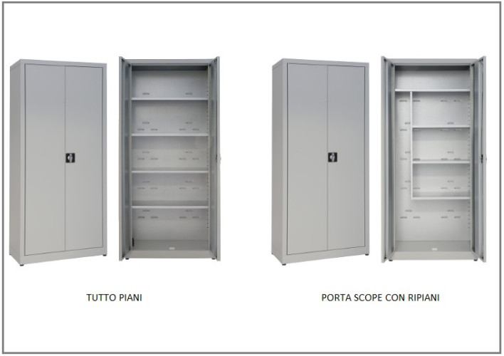 Armadio zincoplatificati su misura dotato internamente di ripiani spostabili rinforzati, oppure con vano verticale porta scope.