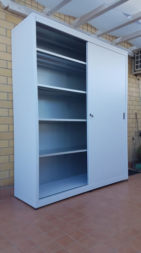 Armadi metallici a misura, con ante battenti e serratura a chiave, oppure con ante scorrevoli e serratura a chiave.