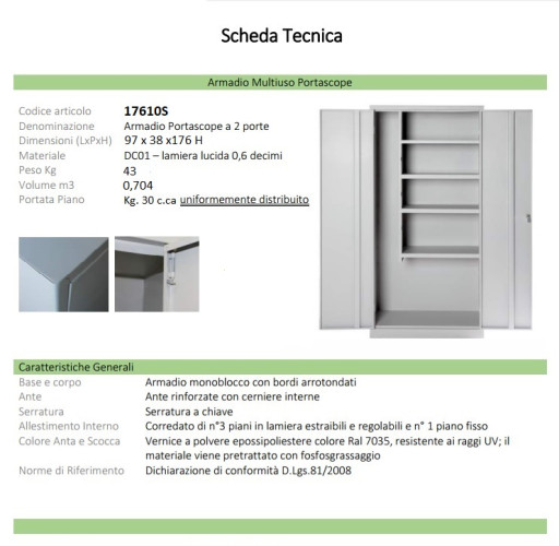 I mobili metallici PORTA SCOPE hanno doppia anta a battente, completa di serratura a cilindro con chiave fornita in duplice copia.