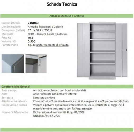 Armadi in metallo vers. TUTTO PIANI con doppia anta battente coni serratura a chiave fornita in duplice copia.
