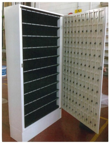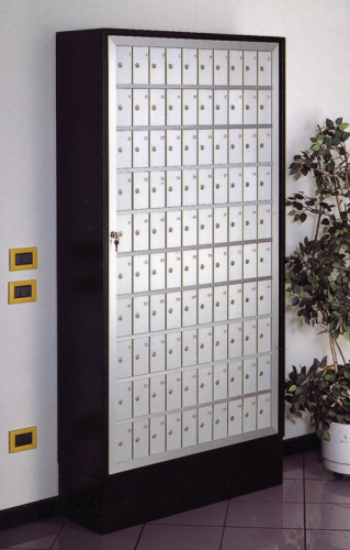 Armadi metallici Porta Valori disponibili in 50 e 100 vani nella versione pensile (...ancorato a parete...) per il modulo da 50 portelle, oppure con piastra di base e 2 gambe tubolari metalliche per il modulo da 50 portelle, oppure con zoccolo inferiore in metallo per il modulo da 100 portelle.