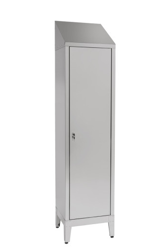 Armadio spogliatoio in acciaio inox AISI 304, versione SPORCO / PULITO, ad un posto, tetto inclinato, una anta battente con serratura a chiave o con pomolo lucchettabile. Vano interno con tramezza e/o divisorio centrale fisso, ripiano inferiore porta scarpe e ripiano superiore fisso.