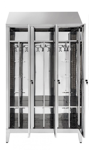 Armadio spogliatoio in acciaio inox AISI 304, versione SPORCO / PULITO, a 3 posti, tetto inclinato, 3 ante battenti con serratura a chiave o con pomolo lucchettabile. Vani interni con tramezza e/o divisorio centrale fisso, ripiano inferiore porta scarpe e ripiano superiore fisso.