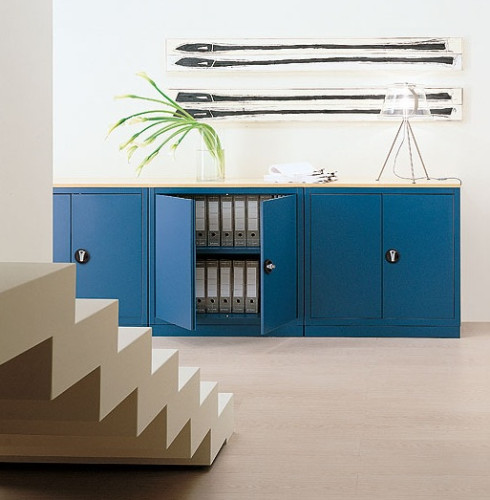 Armadi metallici bassi per archivio, realizzati con lamiera di acciaio, verniciate in *vari colori, bordi arrotondati, ante a battente con serratura a chiave, piani interni spostabili;