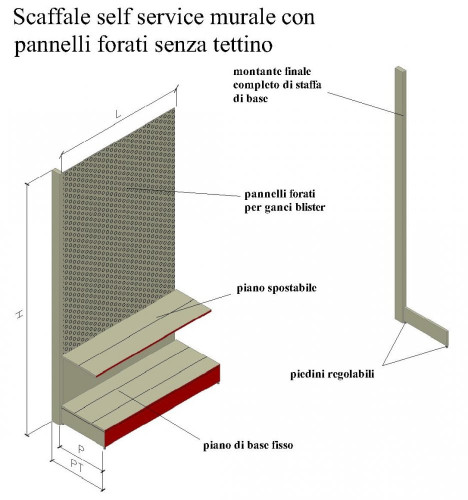 Scaffalature SELF SERVICE, modulari e componibili, tipo murali a parete con fondale e/o schienali posteriori forati per ganci blister.