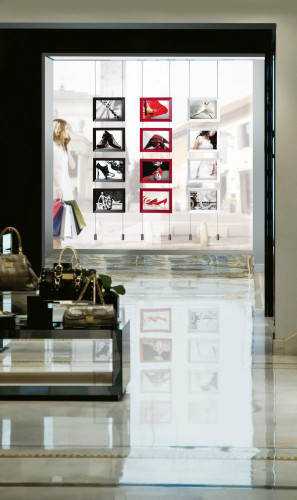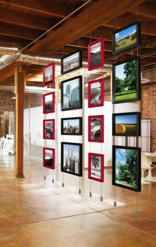 Questo tipo di espositore prevede l'attacco a soffitto e parete, realizzato in tecnopolimero finitura grigio alluminio.