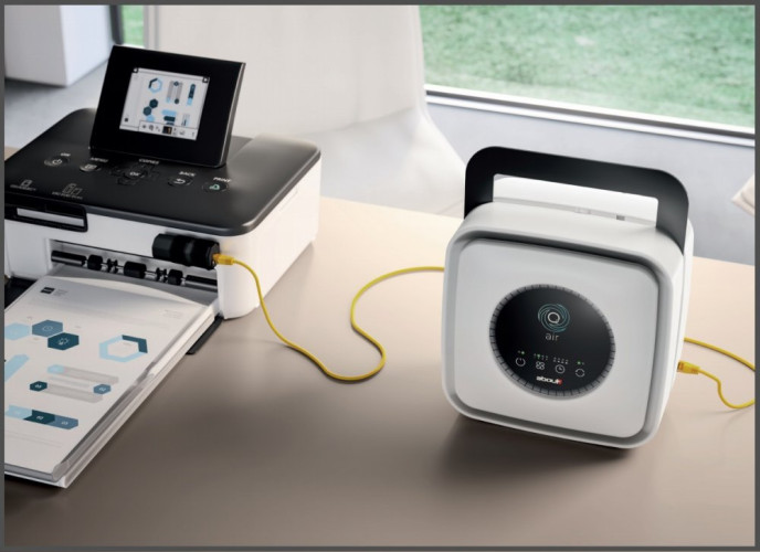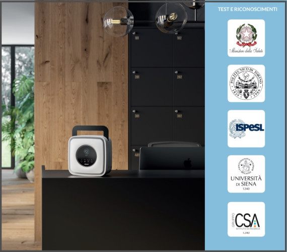 Purificatore d’aria professionale mod. ABOUT, particolarmente adatto a filtrare micro e nano-particelle, dannose per la salute, che si generano in ambienti chiusi durante l’utilizzo di apparecchiature per la stampa con tecnologia laser e toner (stampanti, fotocopiatrici, fax). Grazie al filtro brevettato HeMaCa, e soprattutto attraverso lo STRATO MAGNETICO al suo interno, nei Test in laboratorio si è rilevata l'efficacia di trattenere polveri sottili metalliche, particelle ionizzate e radicali liberi sino alla dimensione di 0,002 μm micrometri. Questo parametro rende unico ed altamente efficace O²air. Oltre ad avere un’elevata capacità di purificazione delle polveri sottili derivanti da macchine per la stampa, O²air è in grado di trattenere anche Virus, batteri, pollini ed allergeni attraverso il filtro HEPA H13 presente all’interno del filtro brevettato HeMaCa. Di seguito la spiegazione di questa affermazione in termini tecnici: • La maggior parte dei Virus studiati in laboratorio, hanno diametro compreso tra 0,1 e 0,3 μm micrometri; • I Virus solitamente non viaggiano in aria da soli, ma si legano ad altre molecole. Ad esempio, in micro gocce di aerosol che viene tossito, starnutito o altro. Queste gocce possono anche avere dimensioni più grandi di 0,3 micrometri, rimanendo sospese in aria. • Grazie allo strato HEPA H13 certificato EN1882, il filtro ha caratteristiche fisiche che hanno la capacità meccanica di trattenere il 99,97% di particelle fino a 0,3 μm micrometri in determinate situazioni di utilizzo. Si evince pertanto che l’innovativa composizione del filtro brevettato a 3 strati HeMaCa è di grande aiuto ed efficacia, poiché contribuisce all’abbattimento della concentrazione di sostanze dannose nell’aria, compresi Virus, batteri ed allergeni. Con questo comunicato non si intende dichiarare che il purificatore d’aria professionale O²air protegga dalla contaminazione dello specifico Virus che si sta attualmente propagando o che possa essere una soluzione al contagio. Si vuole invece chiarire quale sia la capacità che il filtro brevettato HeMaCa può avere nel trattenere i Virus aere-dispersi, contribuendo quindi ad un migliore benessere negli ambienti indoor.