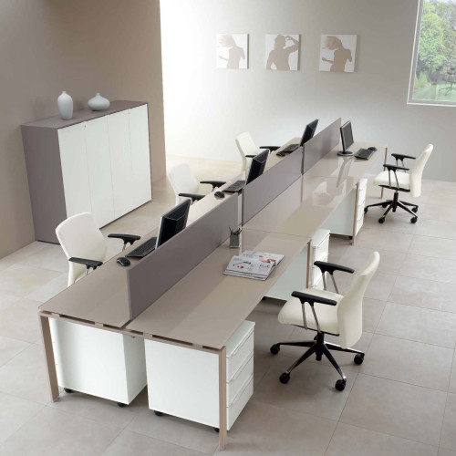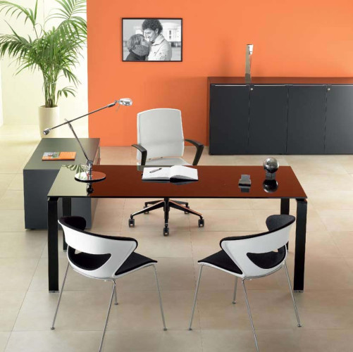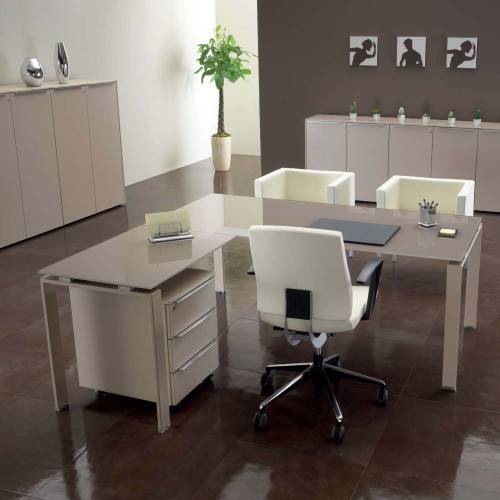 Scrivania operativa mod. ABO, realizzata con piani in vetro temperato di spessore 10 mm., disponibili finitura bianco caldo, cappuccino, verde, nero, cioccolato e blu.
