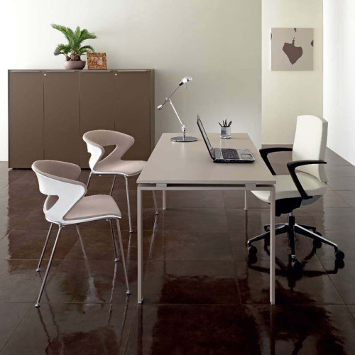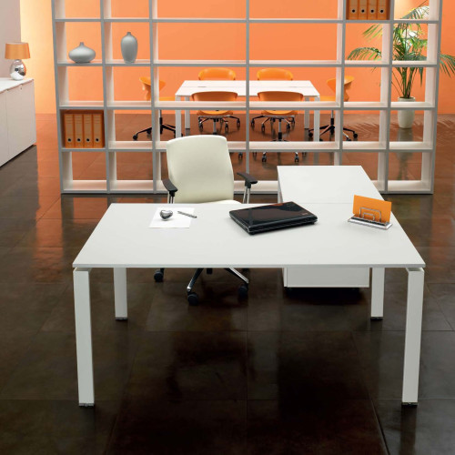 Scrivania mod. ABO, con piani di lavoro realizzati con pannelli di spessore 18 e 30 mm., rivestiti con carta melaminica su due lati con bordi perimetrali abs spessore 2 mm. arrotondati, disponibili in 4 essenze di nobilitato bianco caldo, cappuccino, acero sbiancato e noce.