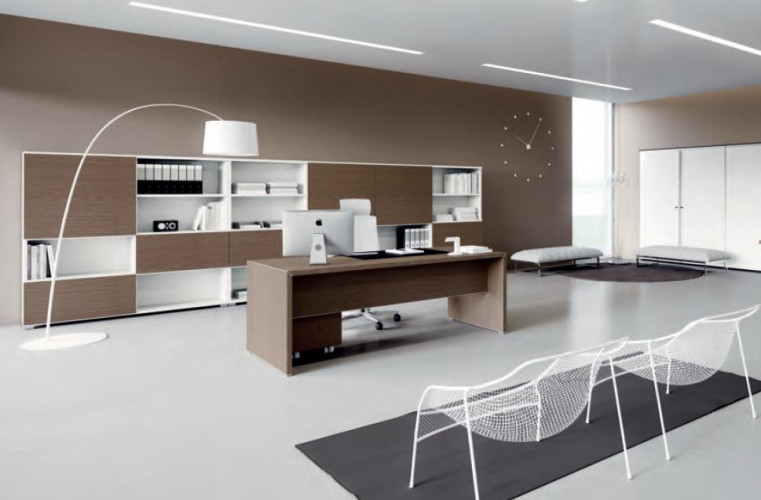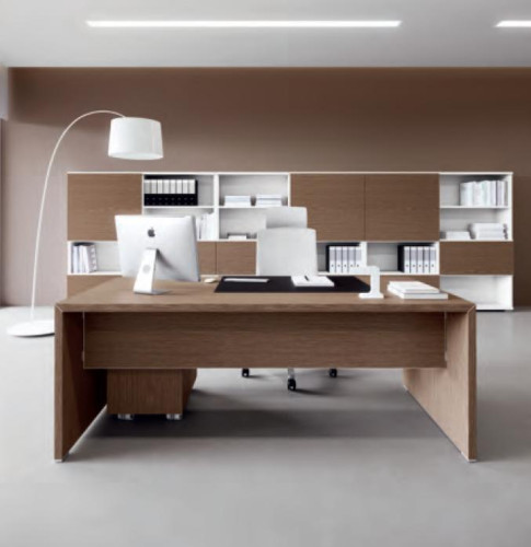 Scrivania direzionale mod. YORK, realizzata con piano di lavoro e fianchi sp. 38 mm., realizzati in conglomerato ligneo con rivestimento in melaminico rovere chiaro, rovere tabacco e rovere moro con bordi frontali in ABS sp. 1,5 mm..