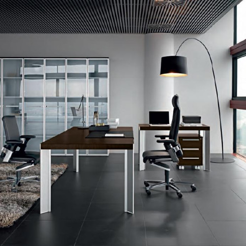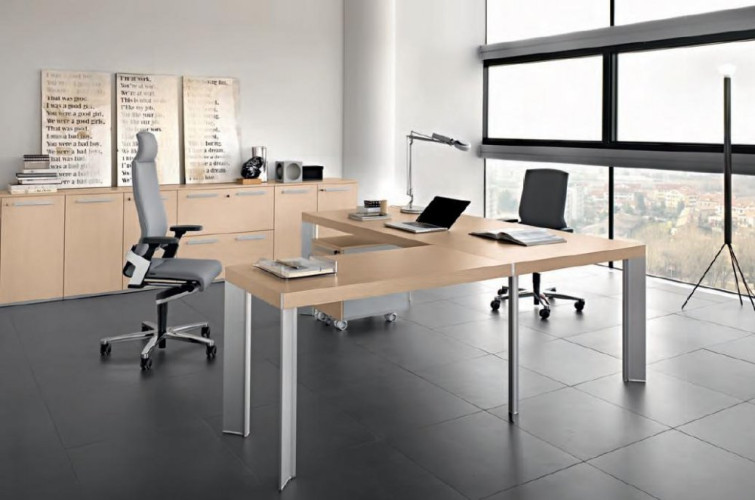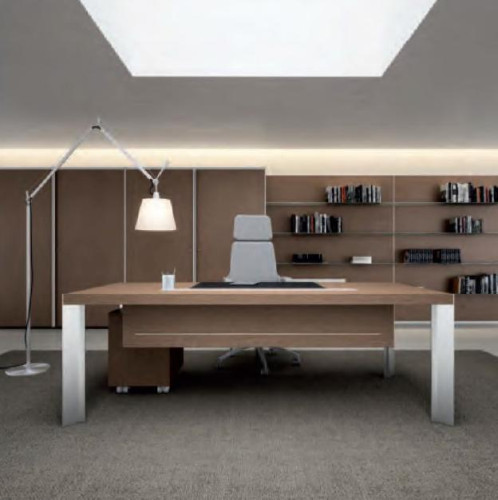 Scrivania presidenziale mod. TAY, realizzata con piano di lavoro in conglomerato ligneo sp. 18 mm., con rivestimento in melaminico rovere chiaro, rovere tabacco o rovere moro, spessore 60 mm.