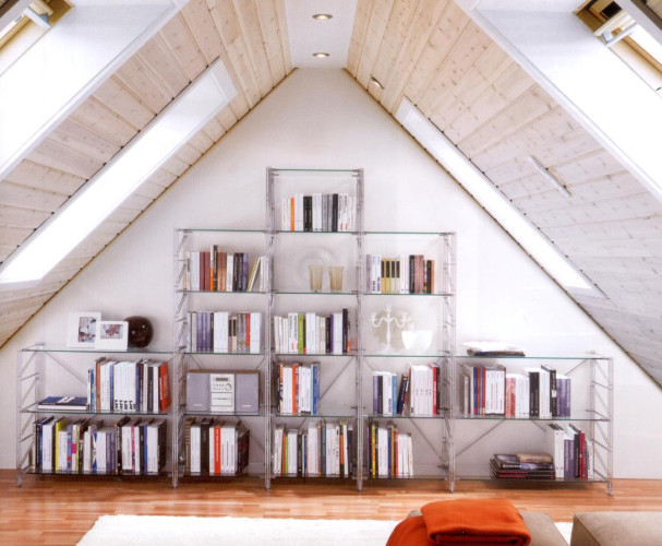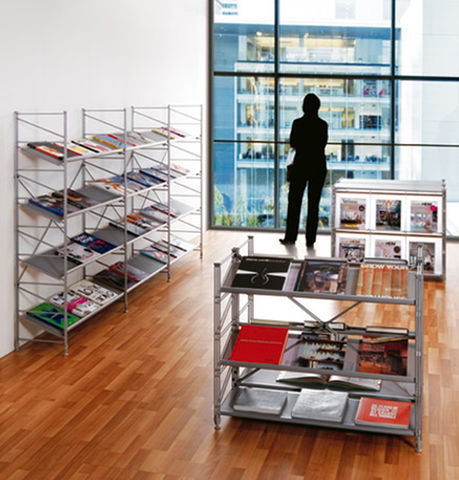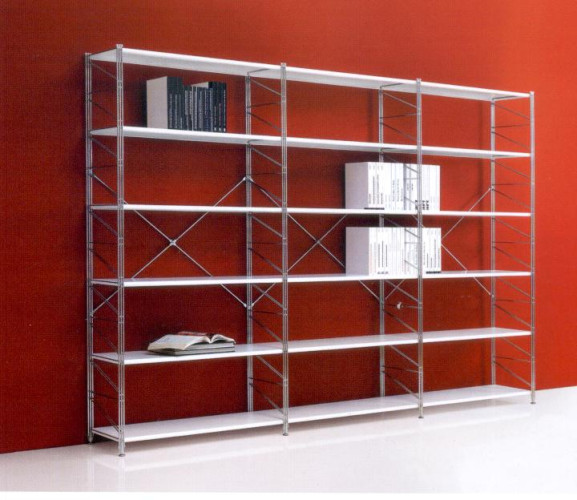 Libreria mod. Socrate, realizzata con fianchi laterali in tondino di acciaio elettrosaldato finitura cromata o verniciata con polveri epossidiche finitura bianco oppure grigio metallizzato.