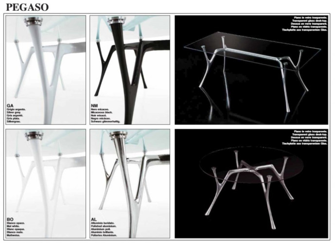 Gambe tubolari e struttura portante in fusione di alluminio verniciato con polveri epossidiche colore bianco opaco, nero micaceo, grigio alluminio, oppure con effetto acciaio lucido.