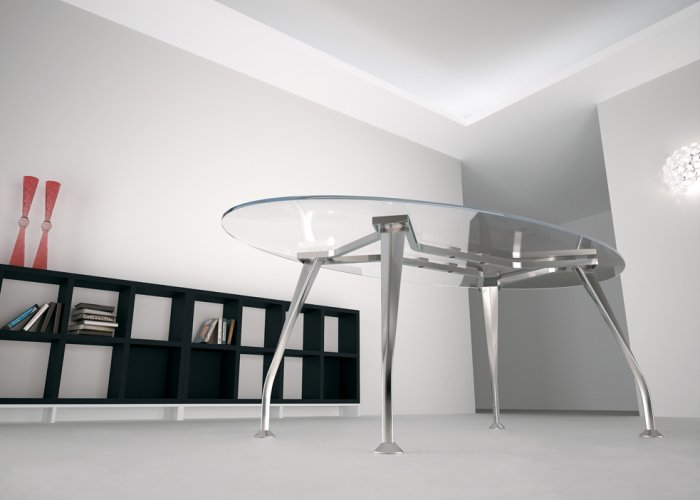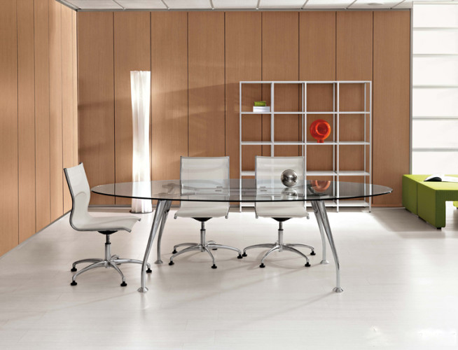 Tavolo riunioni ovale mod. Segno, realizzato con piano in vetro temperato dello spessore di 12 mm., disponibile nella finitura trasparente.