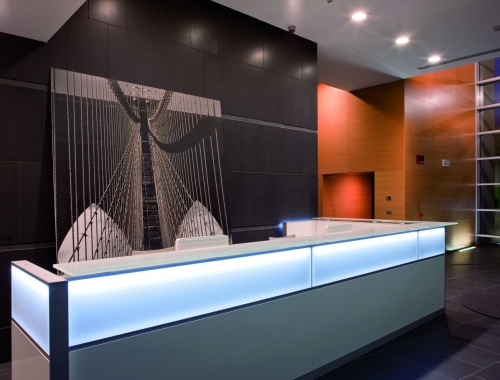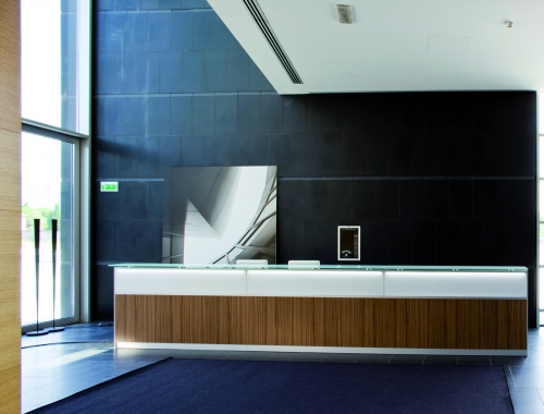 Banco reception mod. LED, realizzato con telaio interno in tubolare metallico 35x35x1,5S mm., colore alluminio goffrato con appositi piedini livellatori neri.