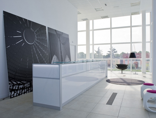 Il top è realizzato in vetro temperato extrachiaro sp. 15 mm., retrolaccato bianco con bordi perimetrali lavorati a filo lucido, corredati di ghiere in zama lucidata, incollate sotto il top per il fissaggio all'elemento verticale portante.