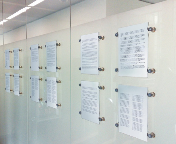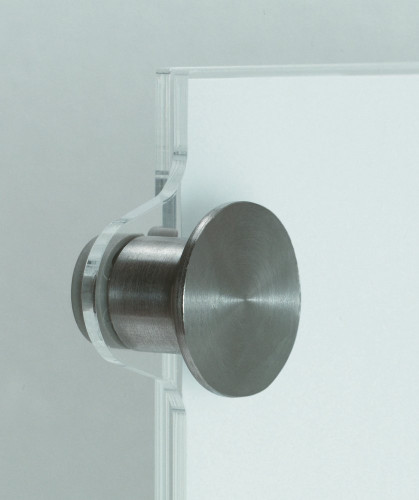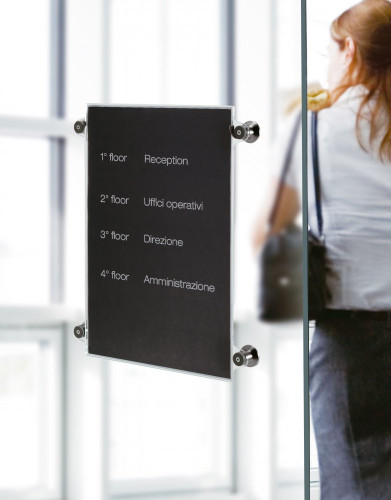 Il fissaggio a pareti in vetro avviene mediante 4 distanziali posizionati ai lati dell'espositore, dotati di una rondella in tecnopolimero grigio, una vite in acciaio zincata e una base in acciaio nichelato dotata di biadesivo.