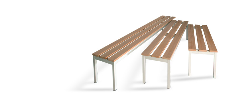Panche per spogliatoio, componibili, realizzate con struttura in metallo colore Grigio Chiaro Ral 7035, piedini in pvc, listelli di legno Ramin, in finitura naturale.