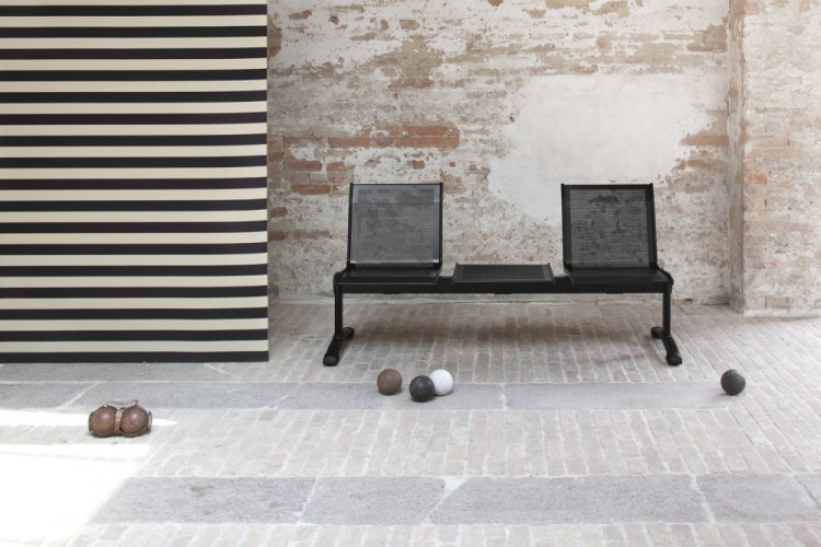 Panca mod. FLY - SLIM, realizzata con trave portante in tubolare di acciaio a sezione rettangolare di mm 80x40, sedute in lamiera di acciaio microforata, gambe in tubolare di acciaio stondato, piedini in abs colore Nero.