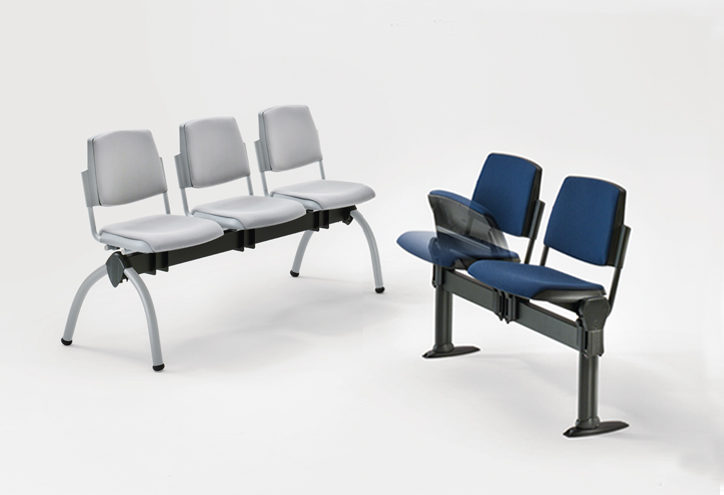 - sedile e schienale in polipropilene antigraffio di vari colori, oppure in legno multistrato a vista verniciato naturale, oppure ombottito in resina poliuretanica e rivestito in tessuto ignifugo oppure in finta (eco) pelle ignifuga di vari colori.