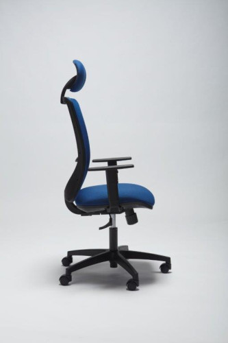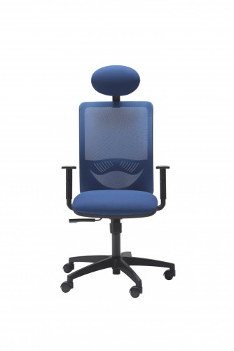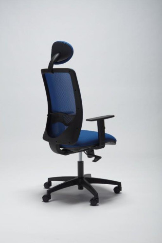 Poltrona operativa mod. RIO SMART, girevole, con alzo a gas, meccanismo syncro regolabile in 3 posizioni, braccioli regolabili in colore Nero, base in nylon nera Ø 680 mm, oppure in acciaio cromato Ø 640 mm, ruote in gomma, schienale in rete di vari colori, supporto lombare regolabile, poggiatesta, seduta imbottita e rivestita in tessuto ignifugo di vari colori, oppure in finta pelle (eco-pelle) ignifuga di vari colori.