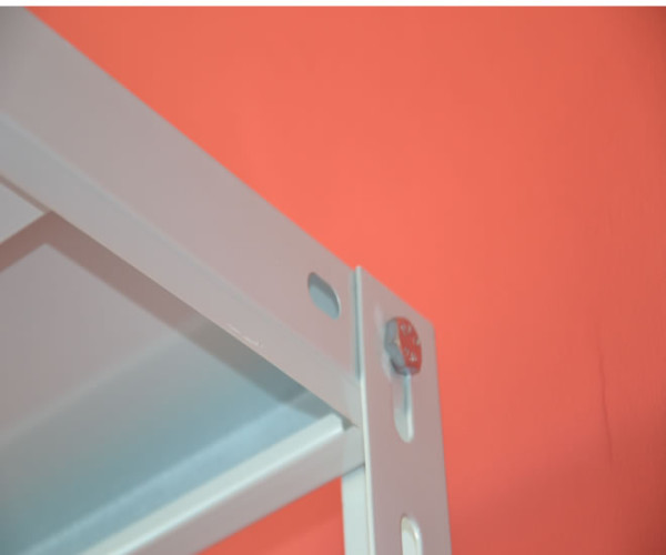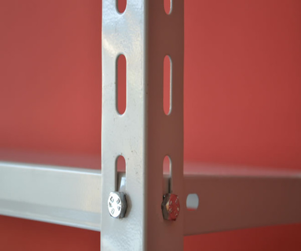 Scaffali a bulloni Bianco, composti da montanti angolari ad "L", realizzati in lamiera da 18/10 di mm di spessore, con asole lunghe mm 9x32, completi di piedino in pvc nero oppure dibasetta metallica per ancoraggio a terra.