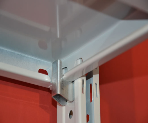 Scaffali metallici a gancio col. Grigio Chiaro con fiancate laterali ad incastro realizzate con lamiere di acciaio sp. 12/10 di mm, complete di piedini in plastica nera oppure di basette in metallo per fissaggio a terra.