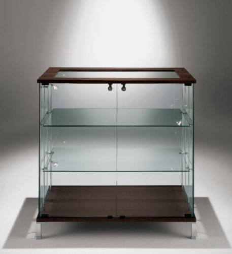 Vetrina KUBICA con base su piedini regolabili satinati, base in laminato finitura wengè oppure Bianco, Faggio, Nero, Acero, Rovere chiaro, Noce o Ciliegio, top in vetro temperato con bordo in laminato finitura wengè, chiusa con n. 02 ante a battente complete di serratura, vetri temperati, piani in vetro spostabili.