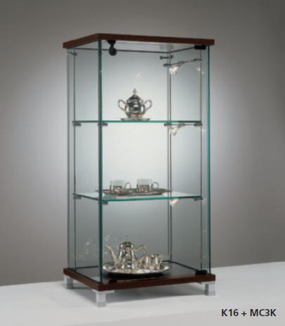 Vetrina KUBICA con base su piedini regolabili satinati, base e top in laminato finitura wengè oppure Bianco, Nero, Acero, Rovere chiaro, Noce o Ciliegio, chiusa con n. 01 anta a battente completa di serratura, vetri temperati, piani in vetro spostabili.
