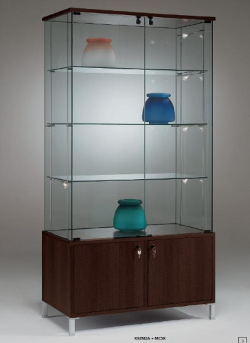 Vetrina KUBICA con base su piedini regolabili satinati, base e top in laminato finitura wengè oppure Bianco, Faggio, Nero, Acero, Rovere chiaro, Noce o ciliegio, attrezzata nella parte bassa con n. 01 mobile in legno in laminato finitura wengè, chiuso con n. 02 ante a battente complete di serratura e nella parte superiore chiusa con n. 02 ante in vetro a battente complete di serratura, vetri temperati, piani interni in vetro spostabili.